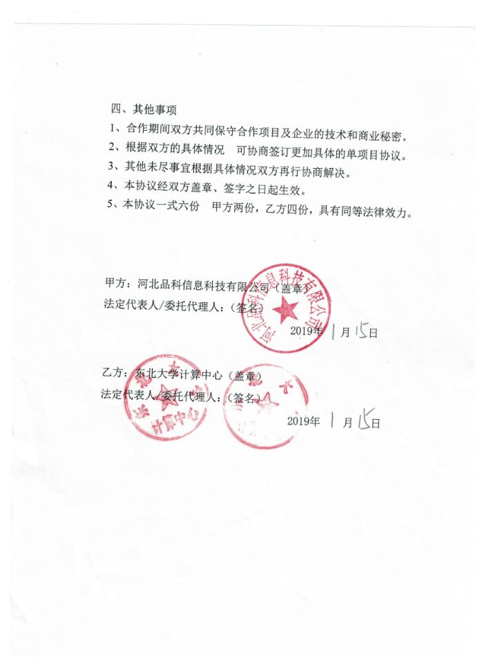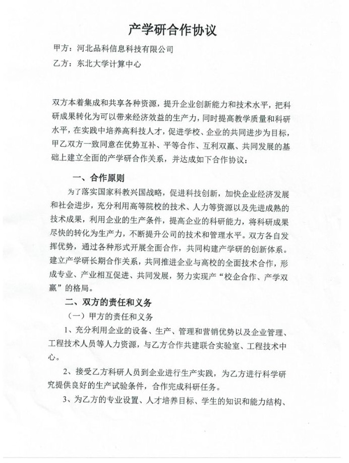 2019年1月15日,河北品科信息科技有限公司與東北大學(xué)計(jì)算中心成功簽訂“產(chǎn)學(xué)研合作協(xié)議書”,雙方本著服務(wù)企業(yè),滿足產(chǎn)業(yè)需求,提高教學(xué)質(zhì)量和科研水平,集成各類資源,提升創(chuàng)新能力為目標(biāo),經(jīng)共同協(xié)商,一致同意在互惠互利、共同發(fā)展的基礎(chǔ)上建立全面的產(chǎn)學(xué)研合作關(guān)系,實(shí)現(xiàn)優(yōu)勢(shì)互補(bǔ),合作雙贏,一致同意達(dá)成此份協(xié)議。此次“產(chǎn)學(xué)研合作協(xié)議書”的成功簽訂,預(yù)示著我司在發(fā)展的道路上又前進(jìn)了一大步。