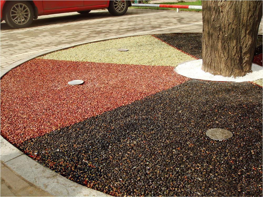 膠粘石透水路面是由改性高分子樹脂為膠結(jié)材料,將天然彩石、拋光色石、玻璃、水晶石、人造骨料等牢固地粘接在一起,鋪設(shè)在混凝土、透水混凝土、瀝青或級配砂石基層上的生態(tài)景觀地面鋪設(shè)材料,具有高效透水、自然美觀、色彩多樣、經(jīng)久耐用等特點??捎糜谕杆跃坝^道路、車型或人行道、公園和廣場等場所,也可應(yīng)用到室內(nèi)場所。