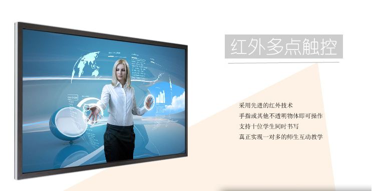 紅外觸摸精準快速(延遲小于5毫秒),紅外多點觸摸技術,免驅動,無需校準,抗強光干擾,人機互動快速有效,支持手指等任何不透明物體書書寫。
