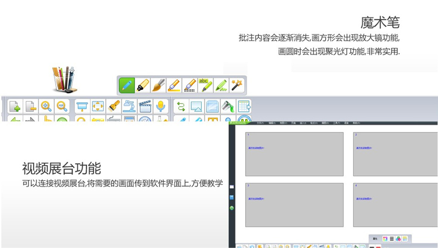 集成了電子白板、平板電視、電腦、投影機、投影幕布、音響、廣告機、WINI等多種功能為一體的互動教學機,從而增強了教學互動性,使教學更簡潔、更簡易、更高效。
